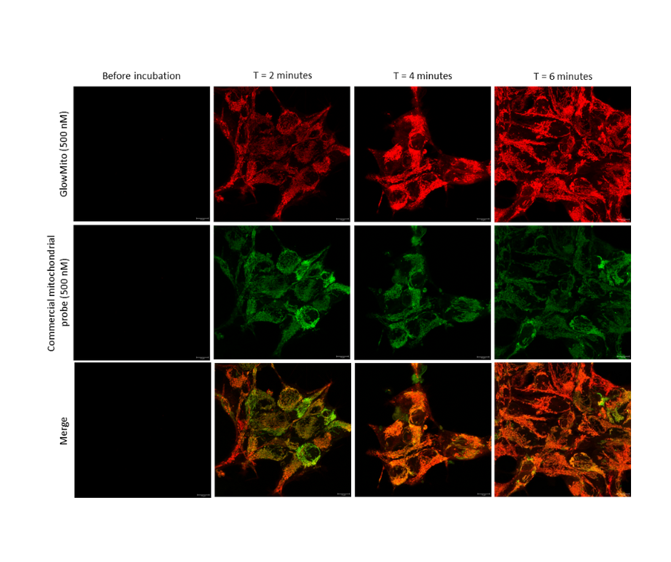 HEK293 cells were observed before and after 2, 4, and 6 minutes of incubation with GlowMito 500 nM.