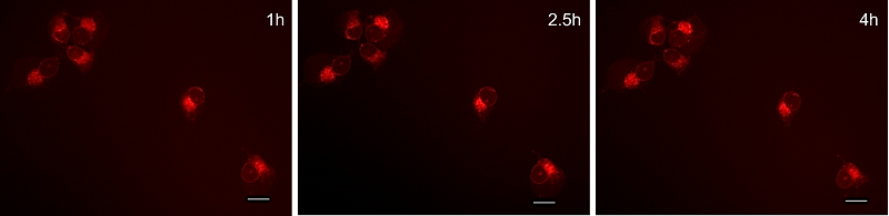 GlowMito was directly added at 500 nM in live COS-7 culture medium. Cells were imaged repeatedly after 1h, 2.5h & 4h of incubation with GlowMito. Scale bar = 20µm.